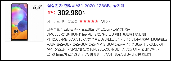 이상 갤럭시A31 가격 스펙에 대해서 알아보았습니다. 가장 눈에 띄는건 단연코 카메라스펙인듯 합니다. 최신 기종인 갤럭시S20하고도 비교가 될만큼의 스펙인데요. 저가 스마트폰 중에서 추천드리는 기종 중 하나입니다. 글 읽어주셔서 진심으로 감사드리며 좋은 가격에 구매하시길 기원하겠습니다~~ 감사합니다^^