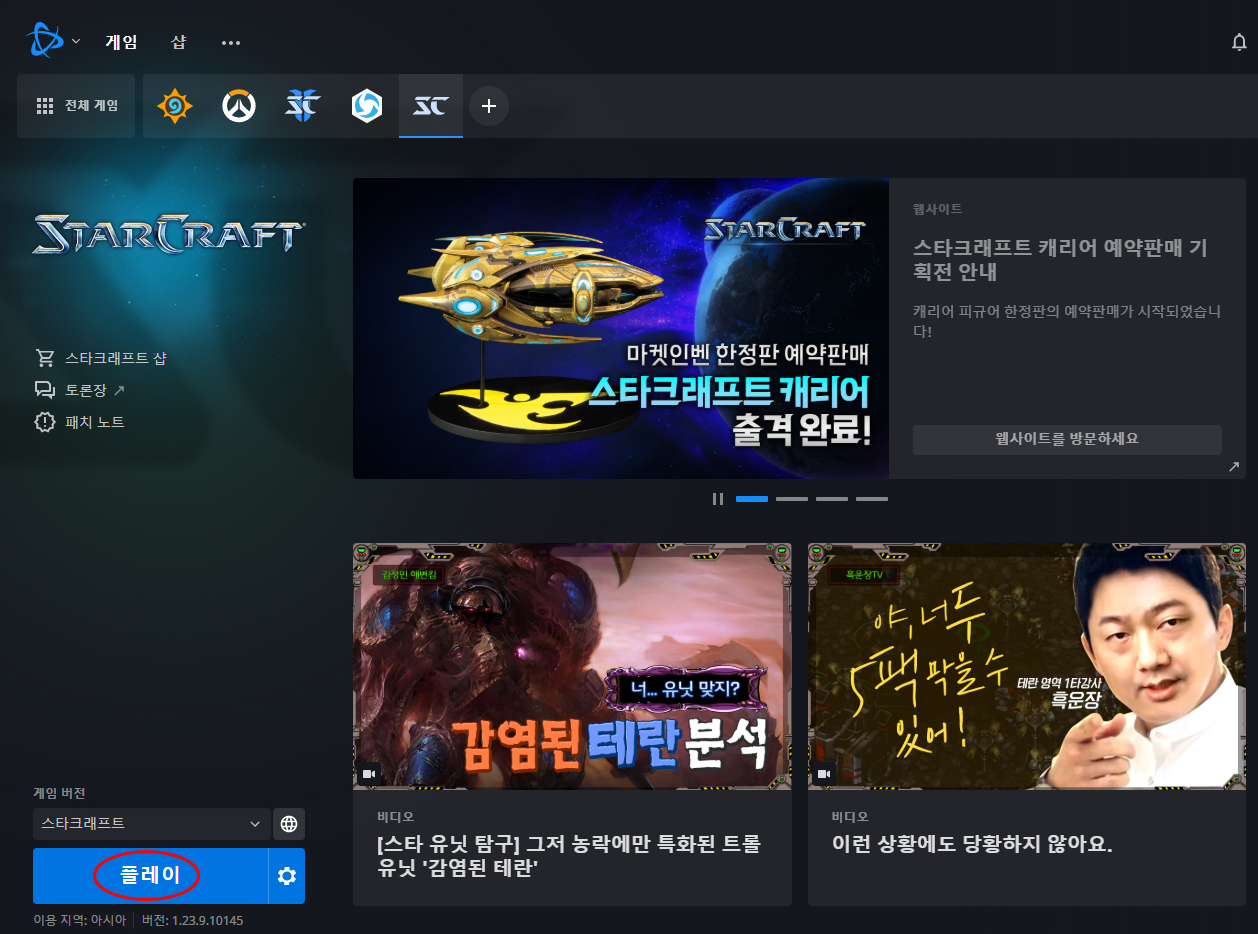 스타크래프트 창에서 오른쪽 하단에 플레이버튼 누르면 실행됩니당!!!